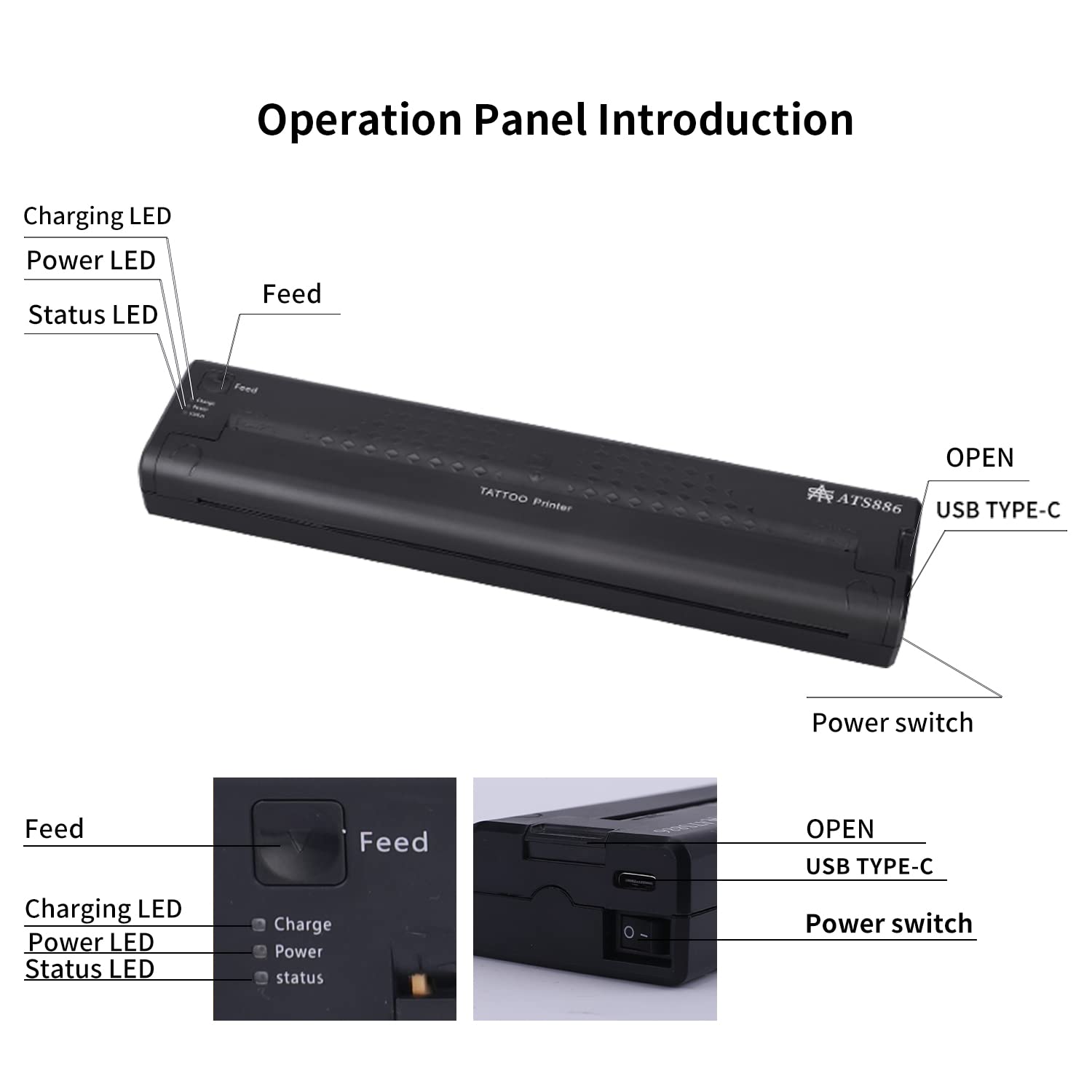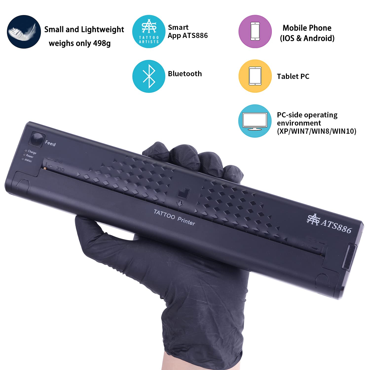ATS886 Bluetooth-Funkdrucker für Tattoo-Vorlagen. Der Drucker funktioniert über USB-Kabel oder Bluetooth. Es ist mit Android- und IOS-Systemen kompatibel. Sie können es über Mobiltelefon, Tablet oder Computer nutzen.